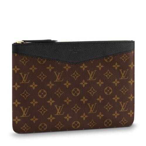- 1 large zipped pocket- 1 inside flat pocket- Monogram coated canvas and cowhide leather- Microfiber lining- Shiny golden color metallic pieces Size: 11.6 x 8.3 x 0.4 inchesComes with Louis Vuitton serial number, dust bag and authenticity card.