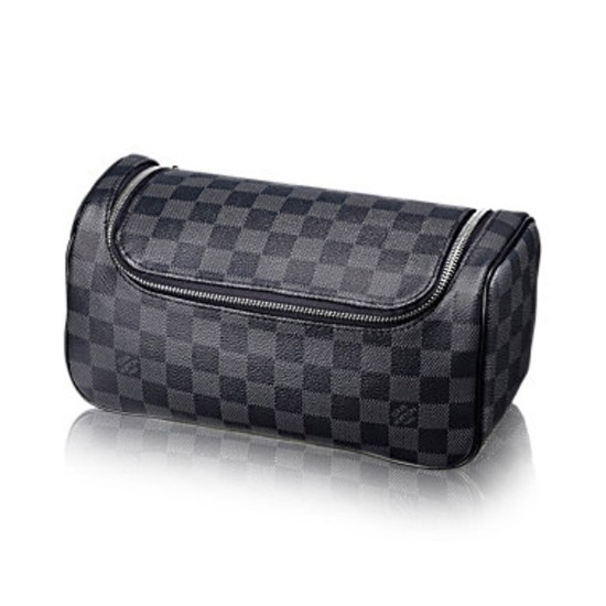 This masculine Toiletry pouch made from Damier Graphite canvas has practical elastic attachments inside that will keep bottles vertical.