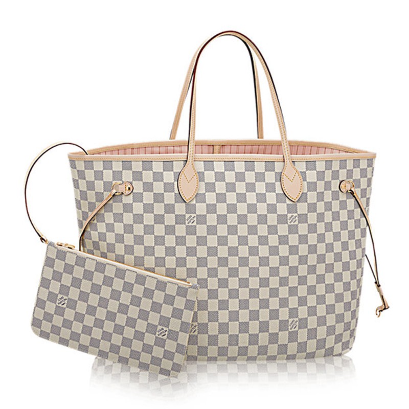 Legendary Neverfull: always exactly what you need it to be. Capacious but not bulky, structured yet supple, at home on the town or in the country. Cinch the side laces, and voila! it's a sleek city bag. Loosen them and you have a chic, practical tote. The slim leather handles fit over the shoulder or on the arm. Shown here in Damier Azur canvas.